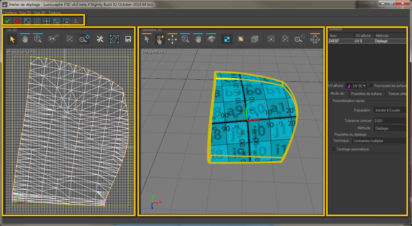 Figure 42 : UV-mapping d’une surface dépliée avec l’option En un clic et vue 3D correspondante.