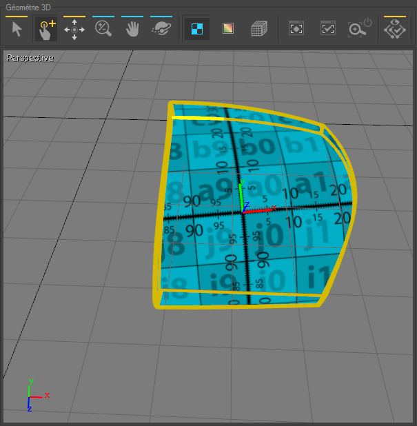 La boîte Géométrie 3D contient une vue 3D interactive dans laquelle sont affichées les surfaces à déplier ainsi que plusieurs outils destinés au dépliage et à la manipulation des surfaces.