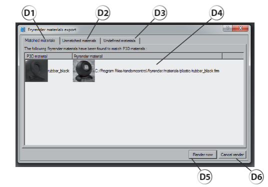 D1: The Matched materials tab lets you display the list of Patchwork 3D Design materials used in the 3D scene, which have their equivalent in fryrender. The correlation is based on the names used in both libraries. These names must match in spelling.
