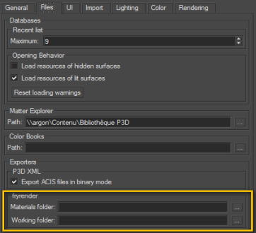 The fryrender exporter can be accessed from the submenu Product > Export > fryrender in Matter. This menu option provides access to the group of parameters concerning the render and to the group of parameters relating to the environment.