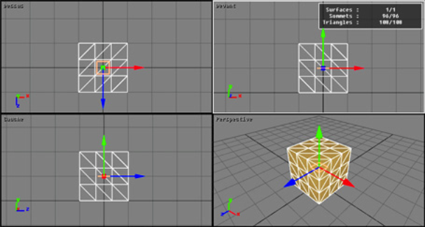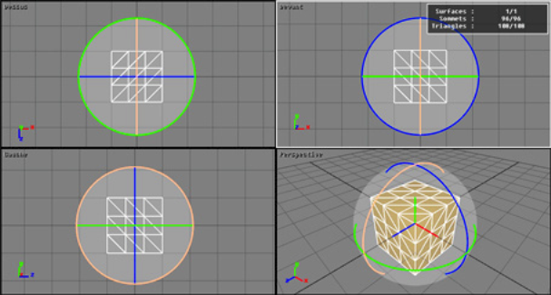The orientation of the surfaces is modified in relation to its transformation referential. When the mouse is moved along an axis (up-down or left-right), the selected surfaces rotate around one of the axes of their referential.