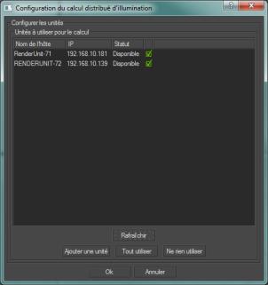 Cliquer sur le bouton Calculer l’illumination en distribué ouvre la fenêtre Configuration du calcul distribué d’illumination, qui sert à gérer les machines de rendu.