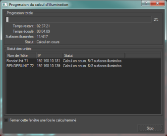 Figure 116 : Fenêtre de suivi de la progression du calcul d’illumination.