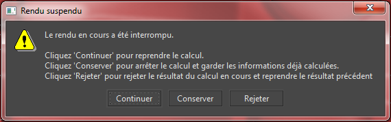 Figure 117 : Trois options sont proposées une fois le calcul interrompu : Continuer, Conserver et Rejeter.