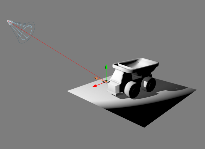 Le point cible du spot dispose de ses propres gizmos pour la translation et la rotation pour faciliter son positionnement. L’orientation de la lumière spot est mise à jour simultanément au déplacement du point cible avec les gizmos de translation et de rotation.