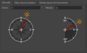 Cet onglet propose de positionner le soleil en entrant une valeur pour l’Azimut et l’Altitude, ou directement avec les widgets en cliquant ou amenant le soleil sur la position désirée.