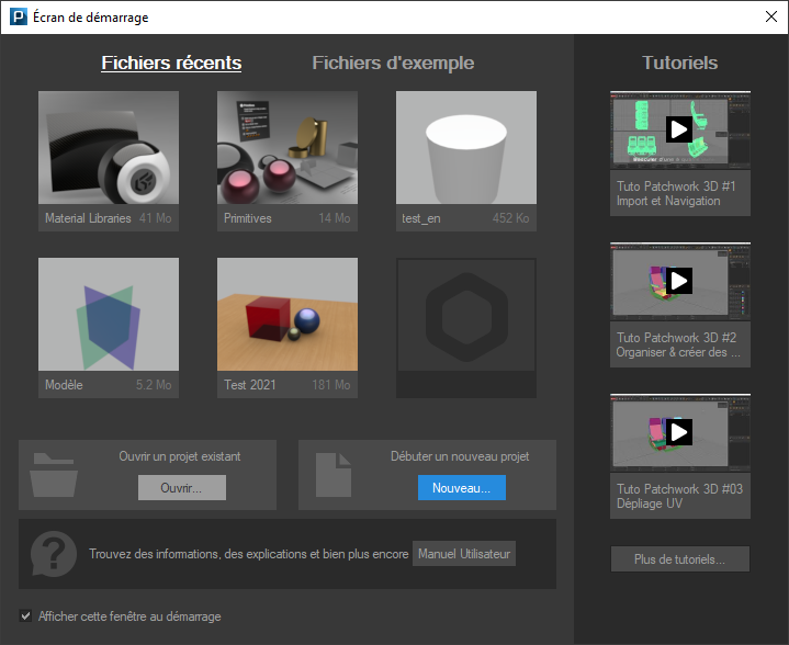 Uncheck Show this window at startup if you don't need this window shows up on the next launch of Patchwork 3D. If you want to see it again, just click File and Show Start Screen.