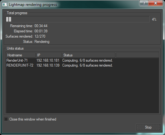 Once the Patchwork Lightmap Render machines have been set up, start the lightmap rendering by clicking the Ok button.