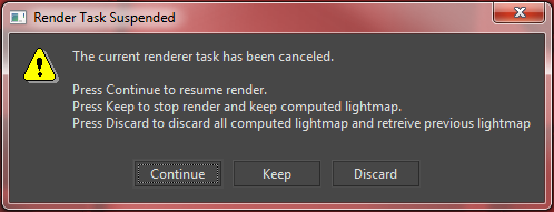 If no machines are connected, Patchwork 3D will continue to try to reconnect with the Patchwork Lightmap Render machines at regular intervals. During this time, the rendering is paused. You may choose to cancel the rendering at this point. You may either save or dismiss the results for the surfaces for which lighting has already been calculated.
