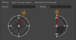 This tab allows for defining the sun position by entering a value for the Azimuth and the Altitude or directly with the widgets by clicking or bringing the sun onto the desired position.